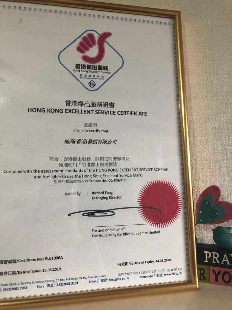 迪高榮獲香港認証中心頒發香港傑出服務証書